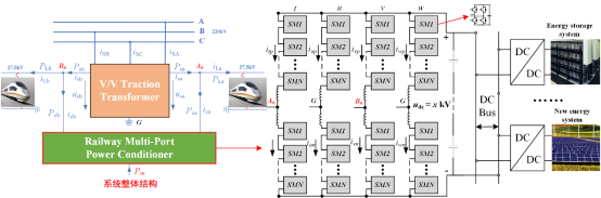 近年来,我国太阳能、风能等新能源发电系统在大规模建设和发展,然而我国光伏、风电等新能源分布式发电系统的安装和建设具有分散性和广域性,主要分布在大西北地区,导致大量新能源系统的并网和消纳问题已严重凸显。与其同时,随着高速铁路轨道网络的建设和快速发展,机车负荷和运营密度都在日益增加,导致铁路负荷电能需求量在日益增大。所以,为了缓解新能源系统和高耗能机车负荷之间的能量供需矛盾,旨在研究一种集成大容量新能源接入的铁路多端口能量路由器(Railway Multi-port Energy Router, R-MER)拓扑及其端口协同控制策略,实现机车负荷、新能源和储能的动态柔性适配,实现铁路沿线新能源的大容量就地接入、消纳和平衡,同时能实现牵引系统的电能质量控制和补偿,缓解供需矛盾,实现两者的互补和共赢。
