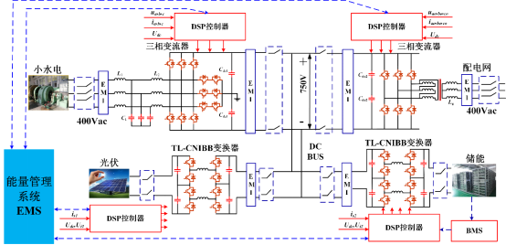 低压配网380V多端口能量路由器实验平台:包括小水电模拟端口、并网端口、储能端口和光伏端口及能量管理系统,端口变换器功率500kVA,公用直流母线,直流电压控制在700V-800V。技术研究点:①三电平直流变换器的PWM调制及控制策略研究;②并网端口的多场景运行控制策略研究;③多端口系统的协同控制策略研究;④多端口系统的建模及稳定性研究。