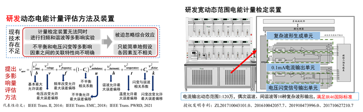 环境温湿度、磁场和动态负载等多因素同时作用下的电能表性能可能退化,直接影响电能交易的公平合理性。然而现有电能计量检测手段主要适合于单一因素下的性能评估。针对复杂工况下电能计量性能评估的迫切需求,我们发明了基于泰勒展开的有功功率快速测量方法,建立了计及谐波与闪变的电能计量方法及误差综合评估模型,提出了计量性能检测中微弱信号电连接干扰模型及测量方法,构建了检定标准源输出电压反馈控制策略及装置,攻克了功率放大器因幅频特性限制无法准确输出动态畸变信号的技术难题。IEEE Fellow、TEMC原副主编David Pommerenke评价我们的微弱信号电连接干扰模型“widely adopted in PIM analyzers”。成果应用于国网江西电科院生产的动态电能计量检测装置中,华东计量测试研究院的检测结果表明:电能计量评估稳态误差范围±0.05%,动态误差范围±0.2%,已在深圳、郑州等电测仪表领域的上市企业推广应用。