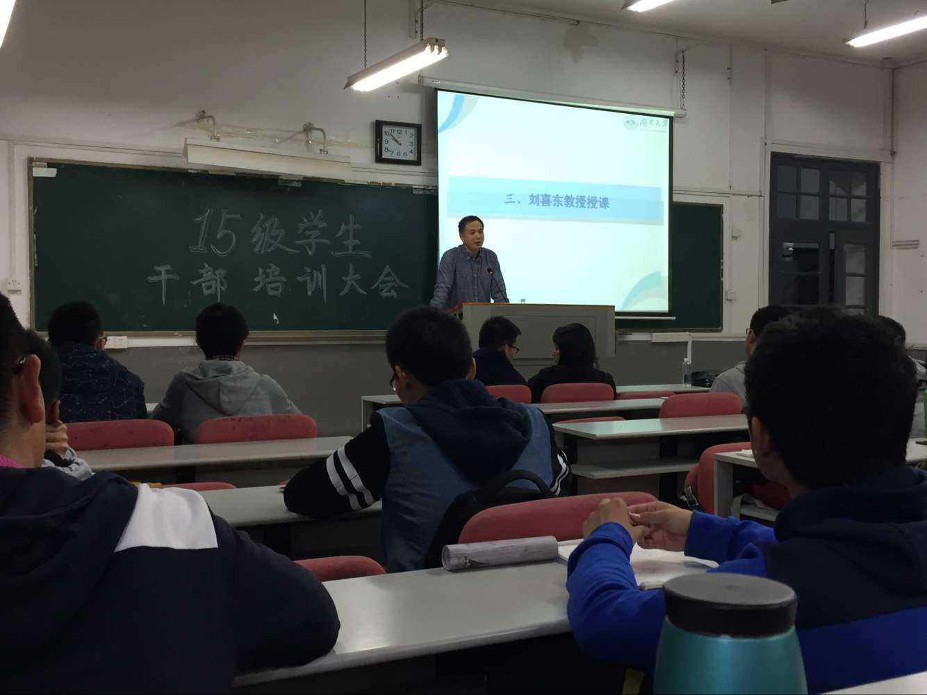 党委副书记刘喜东教授担任培训会主讲。院学工办主任、团委书记张佳老师,15级辅导员付亚宾老师,院学生会主席潘毅学长作为嘉宾出席了此次培训会。15级辅导员彭清萍老师担任主持人。