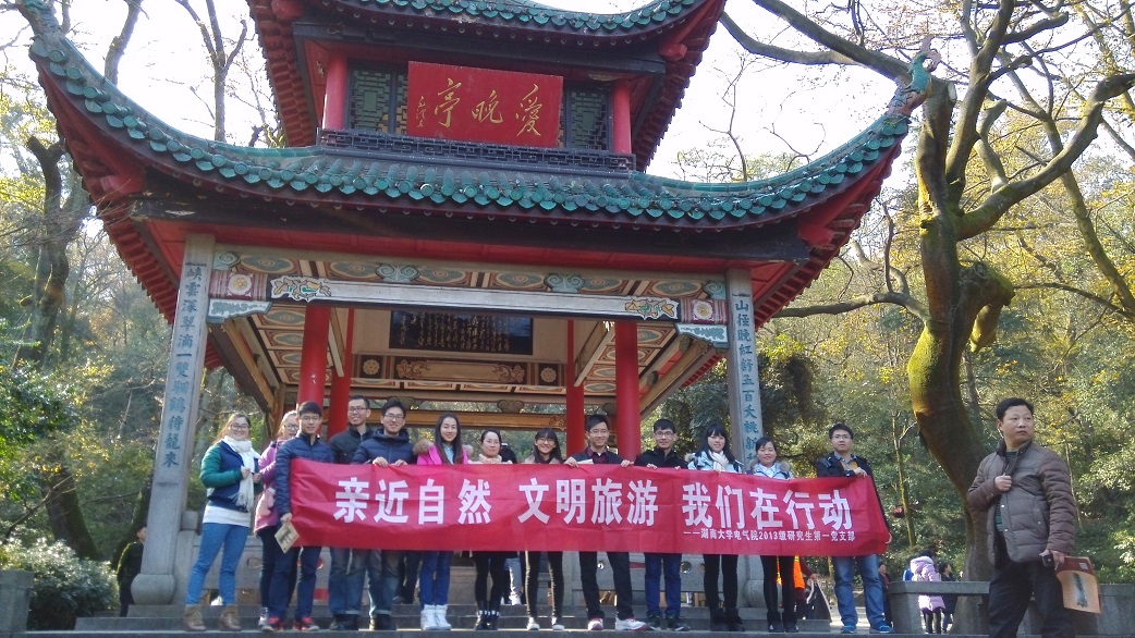 岳麓山风景区是国家AAAAA(5A)级重点风景名胜区,也是中国四大赏枫胜地之一,每一天都吸引全国各地大批游客来游玩。然而,由于个别游客环保意识差,出现了一些不文明旅游行为,比如乱涂乱画、刻字、乱扔垃圾、破坏文物古迹等,这严重影响了景区的环境,成为了文明旅游,绿色旅游理念传播的绊脚石。为提高公众文明旅游的意识,创建文明和谐的旅游环境,电气院研究生2013级第一学生党支部,于2015年12月17日组织了这次活动主题为“亲近自热,文明旅游,我们在行动”的党日活动,旨在严格要求自己恪守绿色环保的原则,发挥党员模范带头作用,做文明旅游、绿色旅游的形象大使,更要发挥党支部战斗堡垒作用,倡导文明旅游,监督制止不文明行为。