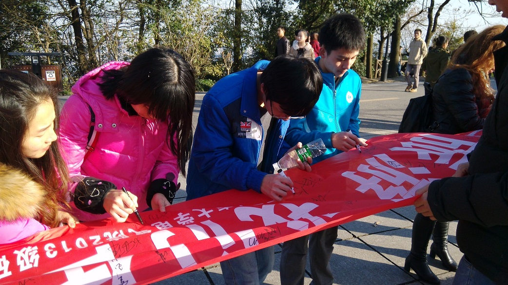 随后,我们登上岳麓山,在山顶进行宣传,并请游客签名。