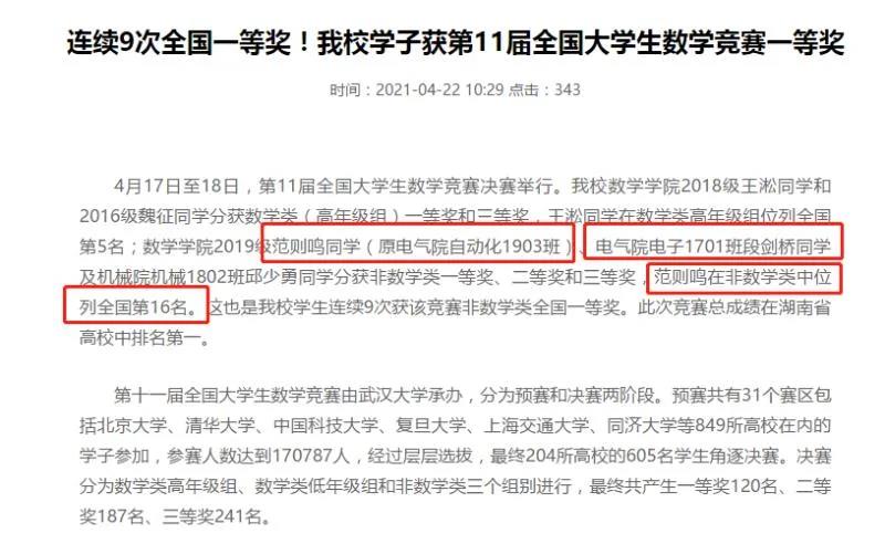 2021年4月17日至18日,第11届全国大学生数学竞赛决赛举行。数学博彩平台 2019级范则鸣同学(原电气院自动化1903班)、电气院电子1701班段剑桥同学分获非数学类一等奖和二等奖,范则鸣在非数学类中位列全国第16名。这也是我校学生连续9次获该竞赛非数学类全国一等奖。此次竞赛总成绩在湖南省高校中排名第一。