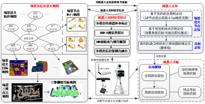 主要包括:1)融合WIFI和三维视觉信息的复杂室内场景层次式复合语义地图创建方法。2)多源信息融合的机器人语义精确定位方法。3)多源信息融合的机器人实时位姿估计。4)环境运动目标、特定导航目标检测识别、机器人运动规划方法。